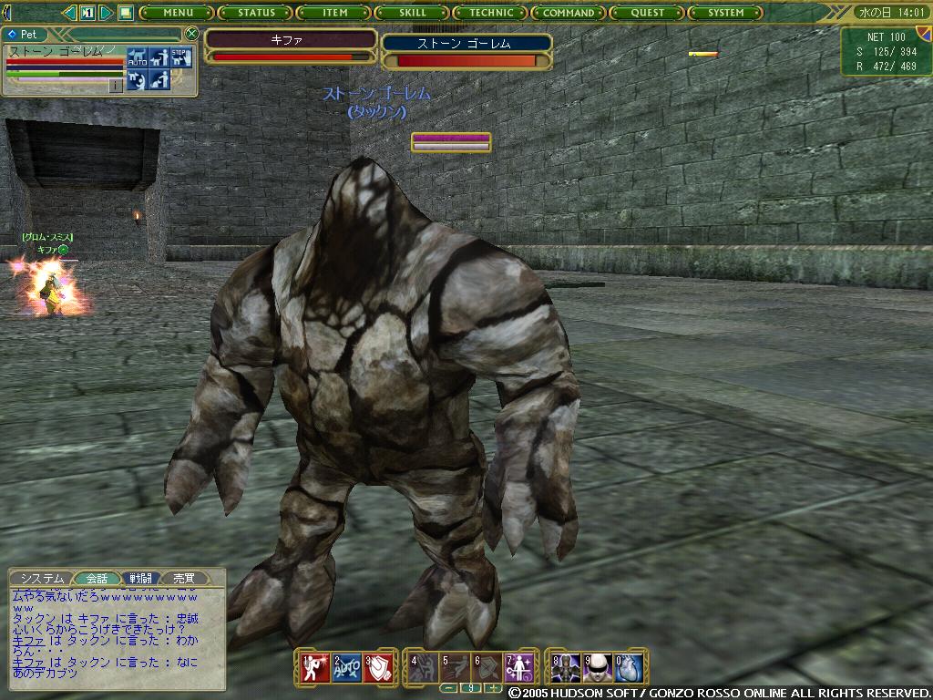 2nd[タックン]:やっとゴレムがミスリルゴレムに進化した2ndの完全支援型テイマー 最近モチベーションがあがってきている 主な使用ペットはミスリルゴレム、グレイブンこんな感じかな イビタンは500Kで売りますたケラケラ 3rd[ラクフェス]:過去をやっと受け入れ釣りキャラとして生まれ変わりそうなモニオ だけどすでに釣りには飽きている 4th[ドミトリィ]:Siestaを辞めHagdの正社員となったがHagdも辞め新しいFSに入ったワラゲ専用キャラ 自然調和を入れたことにより高速機動による追撃、逃走が可能になった なお素手を抜き投げを入れたことで完全に追撃or集団戦専用に しかし投げがなかなか当たらない ちなみにいつもSTかつかつの燃費の悪い子 5th[ウォーレン]:過去はジャスタンを目指したが挫折し暗黒命令と死魔法を取ってしまったジョーカー 死体回収とリープを楽しみに生きている ちなみにMPが100しかないので魔法は一発しか撃てない 6th[アルシエル]:ついに消されてしまった今は亡きヌタオ スマン・・・俺がしっかりしていれば 7th[アイオーン]:ついに手を出してしまったネタキャラ荒くれ者 輝くその体は敵の攻撃をものともせず(ファンタスティックボディ) 敵を打ちのめすその光は爆炎が吹き荒れるほどだとか(フィニッシングエンド) まさしく漢ここにあり (C)2007 HUDSON SOFT / GONZO ROSSO All rights reserved. 株式会社ゴンゾロッソ及び株式会社ハドソンの著作権を侵害する行為は禁止されています。