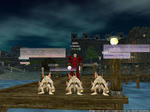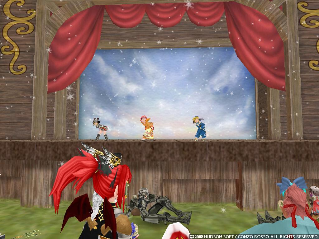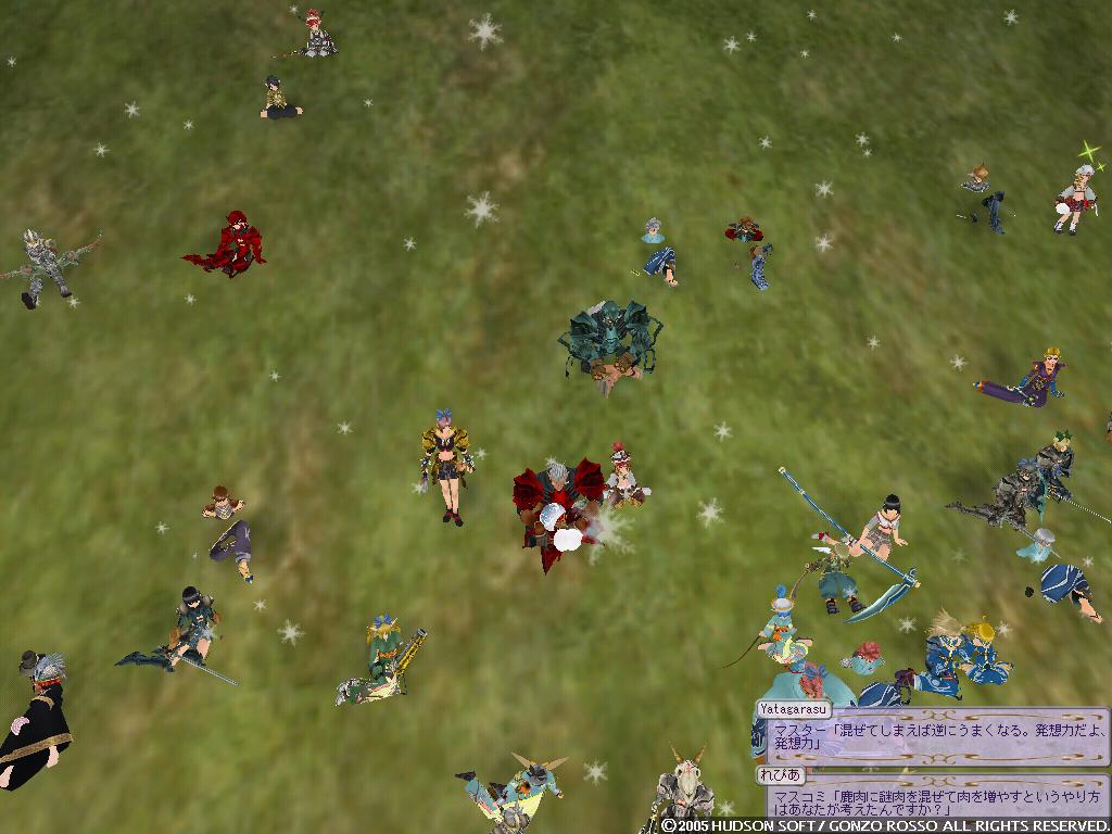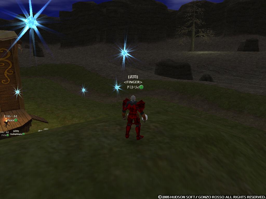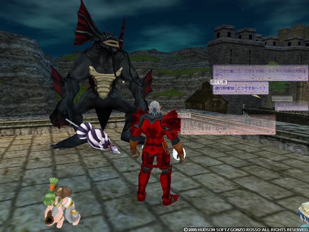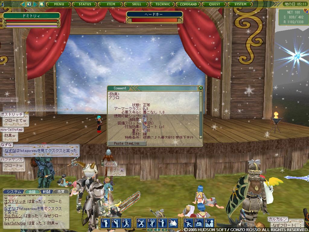 闇商人に会い損なったんでヒマでヒマで・・・ でいざ港に行ってみると・・・ いっぱいいるなぁ・・・前に来たときも結構居たけどこれはすごいw イロイロ買ってお祭り気分!! お小遣いは2Kだけだったので安物をチョコット買いましたとさ ヒャホーイ わたがしメイスにうちわシールドGET 動物臭いおにぎりも手に入れ いざイベントがあっている場所へアルターでGO!! 光るライト?に誘われて進んでみると・・・ 人がイッパイw とりあえず座ると・・・ なんかマスターが前にいるんですけど しかもノリノリ コントはバナミルに謎水を混ぜたFSミートとかなんとか・・・ 結構面白かったよウン 内容は教えちゃいけないような気がするから教えないけどさ ぇ でGMからコントしてた人にプレゼント~ ・・・アフロ・・・ すげぇホッシイ!! チクショーいいなぁ・・・ 次はモニ子のダンスだとかw ワクワクして待ってると・・・ ぇ・・・浮いた? なんか昇天していくように舞台の上の方へ・・・ワイヤーアクション? それとも「もうダメだよパ○ラッシュ」みたいな? 演出かレコストのミスか知らないけど とりあえず落ちろコールw みな落ちてきて無事に再開 ぇ まぁなんだ・・・ カワイイ・・・ しかも動きハモってるとか凄いw しかし結構遅くなったのでここで俺退場 最後まで見たかったなぁ・・・ おまけ 釣りをしてる白イッチョン 傘を持ってるドミよりデカイ黒イッチョン